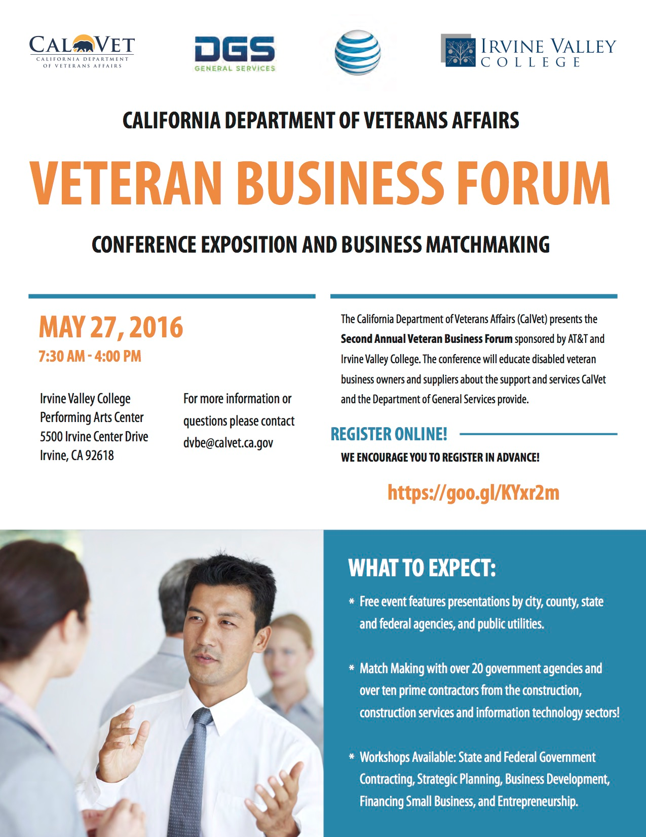 The California Department of Veterans Affairs (CalVet) presents the Second Annual Veteran Business Forum sponsored by AT&T and Irvine Valley College. The conference will educate disabled veteran business owners and suppliers about the support and services CalVet and the Department of General Services provide.